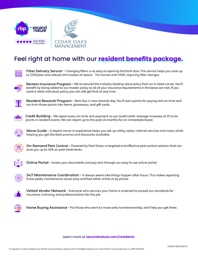 At Cedar Oaks Management, we strive to provide an experience that is cost-effective and convenient. That’s why we provide a Resident Benefits Package (RBP) to address common headaches for our residents. Our program handles insurance, pest control, air filter delivery, utility set up, credit building, rent rewards and more at a rate of $49.95/month, added to every property as a required program. More details upon application.