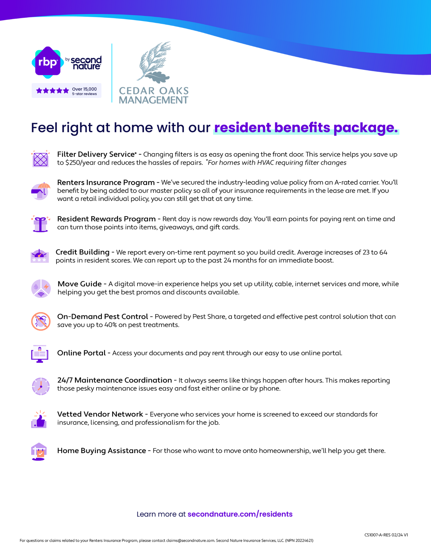 At Cedar Oaks Management, we strive to provide an experience that is cost-effective and convenient. That’s why we provide a Resident Benefits Package (RBP) to address common headaches for our residents. Our program handles insurance, pest control, air filter delivery, utility set up, credit building, rent rewards and more at a rate of $49.95/month, added to every property as a required program. More details upon application.